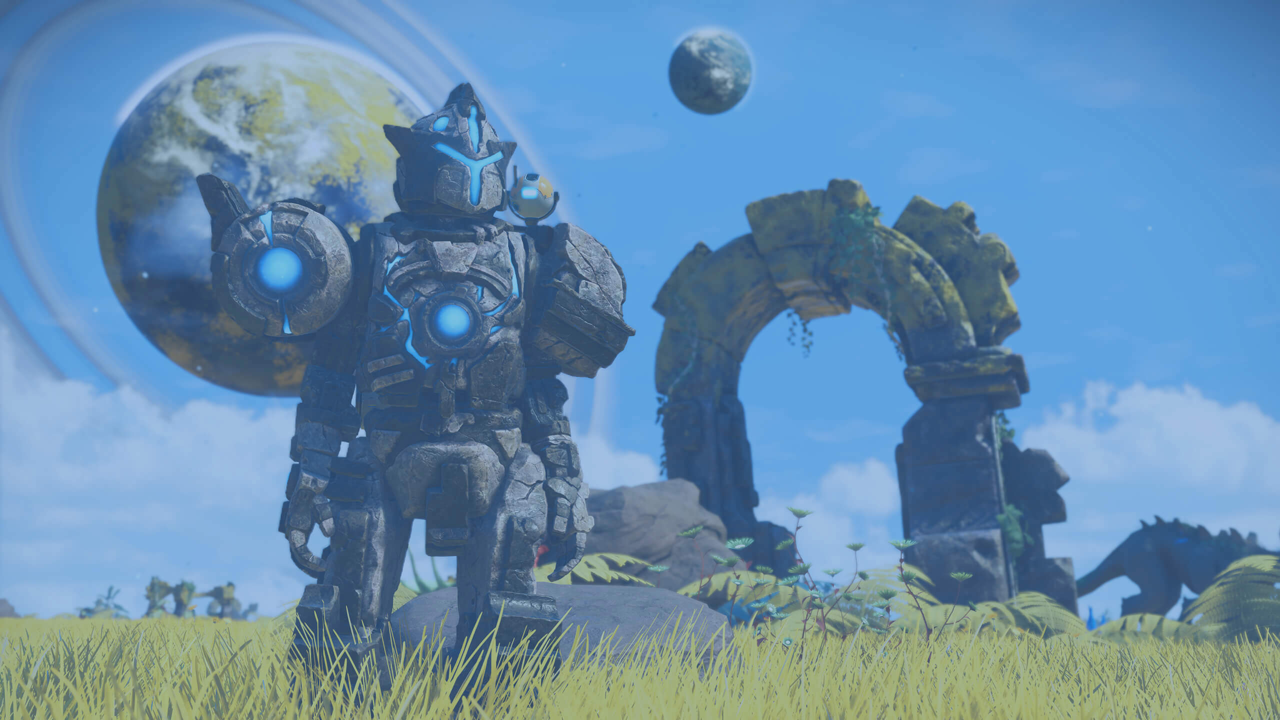The crumbling ruins of relic worlds are watched over by monumental stone figures, vestiges of long-dead alien civilisations. These mysterious effigies appear dormant, their purpose lost to time.